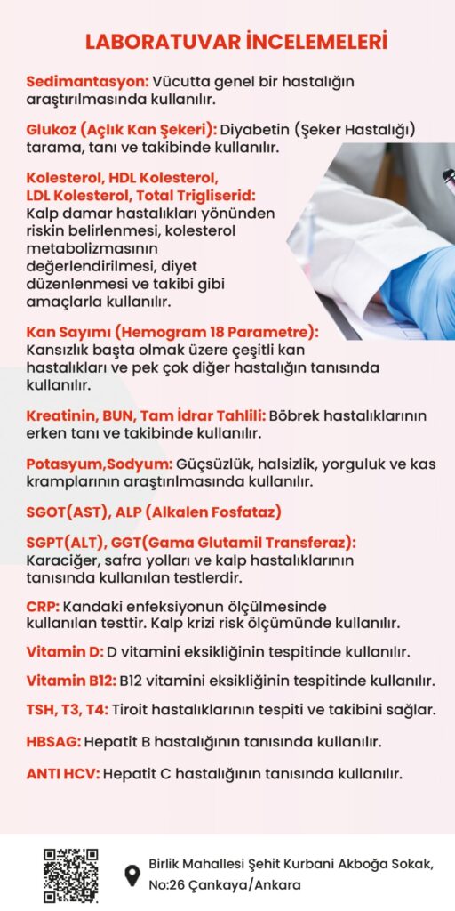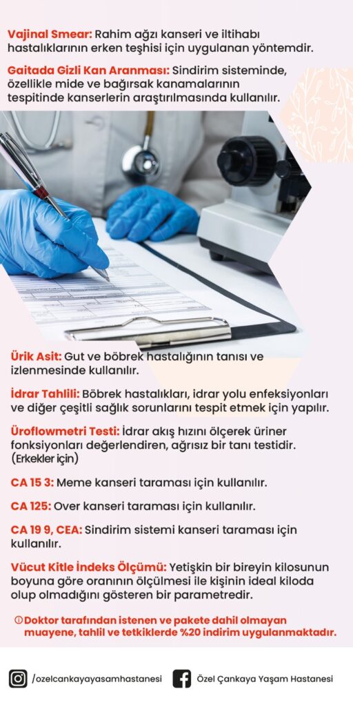 Özellikle kan sayımı, şeker ve kolesterol testleri gibi laboratuvar incelemeleri, sağlığınızın genel durumunu değerlendirir. Özel Çankaya Yaşam Hastanesi, bu testleri en yüksek doğruluk oranı ile sunmaktadır.